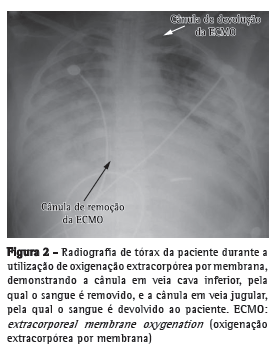 O uso de ECMO veno-venosa foi indicado, a paciente foi canulada com cateteres 20F nas veias femoral direita e jugular esquerda, e a ECMO foi iniciada. Após a estabilização da paciente, essa foi transportada por ambulância (com ECMO funcionante) para a UTI geral do HC-FMUSP. O Simplified Acute Physiology Score 3 antes da admissão na UTI era 79 e o índice Sequential Organ Failure Assessment era 15, demonstrando a gravidade de sua condição clínica e elevado risco de óbito. A radiografia de tórax da paciente imediatamente após o início da ECMO encontra-se na Figura 2. À aspiração traqueal, havia saída de uma grande quantidade de sangue, o que, juntamente com a diminuição das concentrações de hemoglobina e a coagulopatia apresentadas (Tabela 1), sugeriu o diagnóstico de hemorragia alveolar. O suporte com ECMO foi mantido por seis dias, durante os quais foram administradas polimixina, para o tratamento da pneumonia, e imunoglobulina endovenosa, para o tratamento da doença de base. Nesse período, houve necessidade de suporte dialítico com hemofiltração contínua, e houve o desmame da noradrenalina. Em virtude da coagulopatia, optou-se por manter o sistema sem anticoagulação. Não houve complicações decorrentes da utilização da ECMO. A paciente evoluiu com pneumotórax hipertensivo em pulmão esquerdo, tendo sido submetida à drenagem com cateter do tipo pigtail (Figura 3).