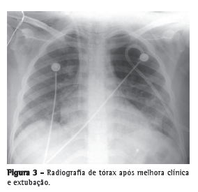 Durante o uso da ECMO, foram realizadas provas de autonomia diárias (tentativa de manutenção das trocas gasosas sem a ECMO, com duração de 1 h, com os seguintes parâmetros respiratórios: FiO2 = 60% e pressões e frequências mantidas). Nos primeiros cinco dias, houve hipoxemia grave, com a diminuição do suporte extracorpóreo. No sexto dia, após resultado satisfatório na prova de autonomia, a ECMO foi retirada, e o suporte ventilatório foi reduzido progressivamente. A paciente foi extubada no oitavo dia e sua radiografia de tórax após a extubação está na Figura 3. A paciente recebeu alta para a enfermaria, utilizando cateter de oxigênio a 2 L/min, e com SpO2 = 98% no décimo quarto dia de internação.