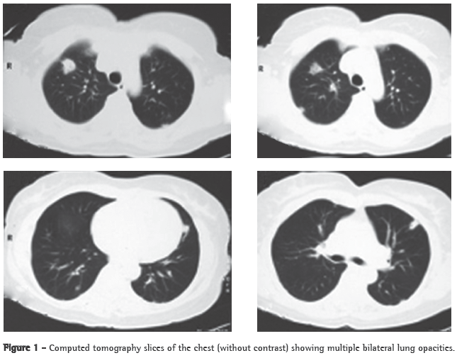 A 56-year-old Caucasian female sought treatment in the emergency room presenting a painful, right-sided neck tumor for 5 days. The patient reported a dry cough and high fever for 3 days. She described herself as a nonsmoker. She was hypertensive and diabetic. She had experienced a myocardial infarction 3 years prior. At admission, the patient was dehydrated and afebrile (axillary temperature, 36.7°C). She presented normal respiration. Laboratory tests revealed increased erythrocyte sedimentation rate (92 mm). Ultrasound of the neck showed IJV thrombosis, and anticoagulation was started on post-admission day 4. A chest X-ray demonstrated at least two nodules in the left lung, one apparently cavitated and one with a diameter of 18 mm at its base, as well as an irregular lesion, 25 mm in diameter, in the right upper lung lobe. A transesophageal echocardiogram, performed in order to rule out endocarditis, demonstrated no vegetation. Due to the hypothesis of pneumonia, empirical treatment with oral cefuroxime (500 mg every 12 h) was started. A computed tomography scan of the chest revealed multiple bilateral lung opacities, with an aspect suggestive of metastatic implants (Figure 1). The patient was then submitted to fiberoptic bronchoscopy, the findings of which were normal. In the microbiological analysis of the bronchoalveolar lavage fluid, testing for acid-fast bacilli and fungi were negative, as were the cytopathologic study and cultures. Since the working diagnosis was metastatic neoplasm, the patient underwent surgical lung biopsy. The anatomopathological examination of the sample showed chronic suppurative inflammation with organizing abscesses in lung parenchyma. In view of the hypothesis of Lemierre's syndrome caused by jugular thrombosis accompanied by septic pulmonary embolism, the patient was questioned regarding the occurrence of tonsillitis at the onset of the disease. The patient had no recollection, but her daughter remembered that the patient had used oral amoxicillin (500 mg every 8 h for 10 days) for the treatment of tonsillitis some days prior to hospitalization. At hospital admission, the patient received a course of intravenous cefuroxime (750 mg every 8 h for 7 days) concomitantly with oral azithromycin (500 mg once a day for 5 days). Subsequently, because fever persisted, she was treated with cefepime (1,000 mg every 12 h for 7 days). A control computed tomography scan of the chest performed after this course of antibiotics showed nearly complete resolution of the opacities (Figure 2). The patient had been afebrile since the third day of the new course of antibiotics. No microorganisms were isolated from blood cultures or bronchoalveolar lavage cultures. Since there is no evidence that it is beneficial in cases of Lemierre's syndrome, anticoagulation was discontinued after 20 days.