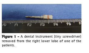 In 1 patient, a dental instrument (a tiny screwdriver; Figure 1) had been aspirated and was lodged into the distal tree of the right lower lobe (Figure 2). The instrument was not found during flexible bronchoscopy. Airway fluoroscopy was performed in order to guide the flexible forceps, and the FB was successfully removed.