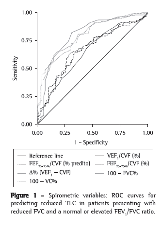 In the present study, clinical diagnoses were valuable for increasing or decreasing the predictive value for a diagnosis of restriction. As expected, many patients with a working clinical diagnosis of obstructive disease presented normal TLC. However, the final diagnosis could not be ascertained for the cases in which the clinical diagnosis on the spirometry request form was COPD and the patient presented with reduced TLC on plethysmography.