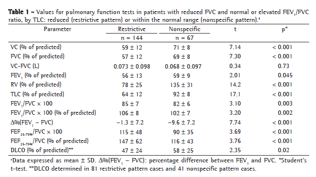 Patients with normal TLC were classified as presenting a nonspecific pattern, whereas those with reduced TLC were classified as presenting a restrictive pattern.