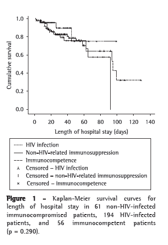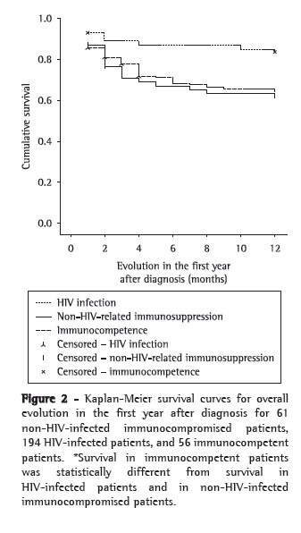 Figure 1 shows the Kaplan-Meier survival curves for length of hospital stay in non-HIV-infected immunocompromised patients, HIV-infected patients, and immunocompetent patients. The in-hospital mortality rates for the non-HIV-infected immunocompro­mised pa­ti­e­nts, HIV-infected patients, and immunocompetent patients were 21.3% (13/61), 17.0% (33/194), and 7.1% (4/56), respectively. There was no statistically significant difference in survival among the groups (p = 0.290). Figure 2 shows the survival curves for the first year after diagnosis, by group. The one-year mortality rates after discharge for the non-HIV-infected immunocompromised patients, HIV-infected patients, and immunocompetent patients were 14.8% (9/61), 18.0% (35/194), and 8.9% (5/56), respectively. There was a statistically significant difference among the three groups (p = 0.022), and survival was higher among the immunocompetent patients than among the HIV-infected patients (p = 0.008) and the non-HIV-infected immunocompromised patients (p = 0.015). Survival did not differ between the non-HIV-infected immunocompromised patients and the HIV-infected patients (p = 0.848).