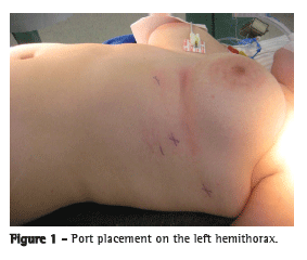 The patient was submitted to general and epidural anesthesia, a double-lumen endotracheal tube was placed, and she was positioned in a left-sided 30° elevated lateral decubitus. The camera port was placed in the fourth intercostal space at the anterior axillary line, and the instrument ports were placed in the third intercostal space at the mid-axillary line and in the fifth intercostal space at the midclavicular line (Figure 1). A three-dimensional 0° camera was introduced for the complete visualization of the pleural space, and the two arms of the robotic surgical system (da Vinci®; Intuitive Surgical, Inc., Menlo Park, CA, USA) were attached. For the left arm, an EndoWrist® instrument (Intuitive Surgical, Inc.) was used, whereas an electrocautery unit was used for the right arm. The left arm was mainly used to grasp the thymus, and the dissection was performed with the right arm.