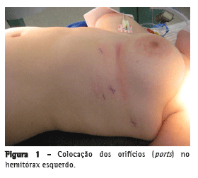 A paciente foi submetida a anestesia geral e epidural, colocou-se um tubo endotraqueal de duplo lúmen, e ela foi posicionada em decúbito lateral esquerdo elevado em 30°. O orifício (port) da câmera foi colocado no quarto espaço intercostal na linha axilar anterior, e os ports dos instrumentos foram colocados no terceiro espaço intercostal na linha axilar média e no quinto espaço intercostal na linha hemiclavicular (Figura 1). Uma câmera tridimensional de 0° foi introduzida para a visualização completa do espaço pleural, e os dois braços do sistema cirúrgico robótico (da Vinci®; Intuitive Surgical, Inc., Menlo Park, CA, EUA) foram acoplados. Para o braço esquerdo, utilizou-se um instrumento EndoWrist® (Intuitive Surgical, Inc.), enquanto, para o braço direito, utilizou-se uma unidade de eletrocautério. O braço esquerdo foi utilizado principalmente para pinçar o timo, e a dissecção foi realizada com o braço direito.