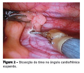 Iniciou-se a dissecção inferiormente no ângulo cardiofrênico esquerdo ao longo do nervo frênico esquerdo (Figura 2). A glândula tímica foi separada da área retroesternal, e o corno tímico inferior esquerdo foi isolado e dissecado do pericárdio.