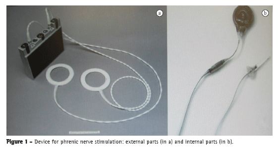 In 1972, Glenn et al.(2) introduced DP with phrenic nerve stimulation for quadriplegic patients on ventilatory support. Although the procedure was successful, increasing experience identified a more physiological method of DP in quadriplegic patients using simultaneous and continuous pacing of both hemidiaphragms. In 1984, the experience of ventilation in five quadriplegic patients who had been submitted to pacing for 11 to 33 months after diaphragm conditioning was reported.(3) The authors obtained promising results, demonstrating that 24-h bilateral pacing of the conditioned diaphragm was feasible.