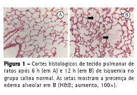 Há, no entanto, evidências inequívocas de que a isquemia por si não é suficiente para desencadear a apoptose. Isso foi demonstrado em cardiomiócitos, nos quais a isquemia sem reperfusão levava apenas a morte celular por necrose. Burns et al. estudaram a apoptose através do método TUNEL antes e após a reperfusão em transplante renal, verificando que a apoptose fora menor na pré-reperfusão e sugerindo que a apoptose ocorreria predominantemente após a reperfusão do órgão.(28) A indução de isquemia pulmonar por ligadura da artéria pulmonar em suínos resultou em isquemia pulmonar crônica e indução de superexpressão de fatores pró-apoptóticos. A adição de reperfusão após isquemia crônica desencadeia apoptose maciça, levando a lesão endotelial.(29) Vários estudos demonstraram que a inibição da apoptose pela ação de drogas inibidoras das caspases resulta em diminuição da infiltração de linfócitos e morte celular, levando a melhora da função pulmonar.(6,30)