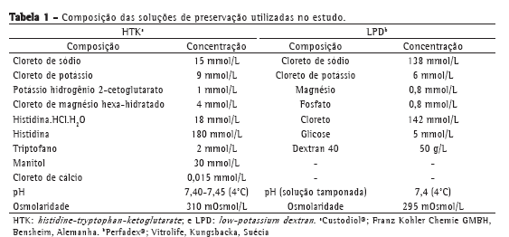 A solução HTK é utilizada como solução cardioplégica e na preservação em transplantes cardíacos. Desde o seu desenvolvimento, diversas modificações foram realizadas em sua formulação, tornando-a mais eficaz em períodos de isquemia mais longos.(22) Uma vez que a solução HTK não havia sido testada em preservação pulmonar em um modelo ex vivo até o momento, caso a sua eficácia fosse comprovada para esse fim, isso permitiria a utilização de uma única solução no momento da extração cardiopulmonar.