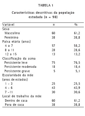 A Tabela 1 apresenta as características gerais da população estudada. Das 98 crianças e adolescentes incluídos no estudo, houve predominância do sexo masculino (61,2%), da faixa etária de quatro a sete anos (58,2%) e da forma persistente leve da asma (76,5%). A escolaridade média da mãe foi de cinco anos de estudo e, quanto à sua profissão, a maioria ocupava-se com os afazeres domésticos na própria casa (61,2%). Dentre aquelas que trabalhavam fora, 19,4% eram empregadas domésticas.