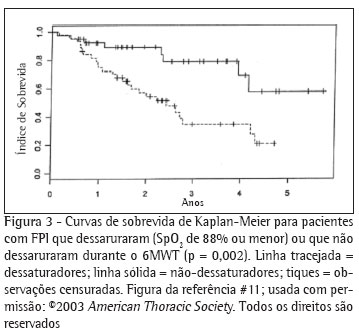 Num estudo com 83 pacientes, incluindo 22 com FPI, Lama et al.(6) revelaram o valor prognóstico da dessaturação durante um teste de caminhada de 6 minutos (6MWT, 6-minute walk test). Entre os pacientes com FPI cuja oxigenação periférica (SpO2) caiu para 88% ou menos ("dessaturadores") durante o 6MWT em ar ambiente, o índice de sobrevida de quatro anos foi de 34.5%. Este índice contrasta com o índice de sobrevida de quatro anos de 69,1% entre os pacientes que não dessaturaram (Figura 3). Os dessaturadores com FPI experimentaram um risco de óbito quatro vezes maior do que os "não dessaturadores".