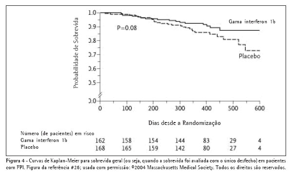 Evidência clínica anterior sugerindo que o IFN-g pode ser uma terapia útil para pacientes com FPI apareceu num pequeno ensaio randomizado e prospectivo no qual 18 pacientes com FPI receberam 7,5mg/dia de predisona e 200mcg de IFN-g subcutâneo três vezes por semana ou o placebo correspondente.(40) Os resultados revelaram melhoras relevantes e clinicamente significativas na fisiologia pulmonar e nas trocas gasosas no grupo de tratamento. Estes resultados promissores levaram a um ensaio multicêntrico, randomizado, duplo cego e placebo controlado em larga escala no qual 330 pacientes foram randomizados para receber IFN-g ou placebo.(41) O IFN-g não teve efeito no desfecho primário composto de diminuição na CVF maior que 10%, aumento no gradiente (A-a )O2 em ar ambiente em repouso, ou morte. Na análise post hoc, quando a sobrevida foi examinada como um desfecho isolado, pareceu haver uma tendência (ou seja, log-rank p = 0,08) de aumento da sobrevida no grupo tratado ativamente (Figura 4). Além disso, dos 254 pacientes com CVF maior que 55% do previsto normal, 21(16,4%) dos pertencentes ao grupo placebo (128 pacientes) morreram enquanto somente 6 (4,8%) dos pertencentes ao grupo IFN-g (126 pacientes) morreram (p = 0,004). Os resultados encorajadores desta análise post hoc levaram a um ensaio maior (800 pacientes), de fase III, com o uso do IFN-g e tendo a mortalidade como desfecho primário.
