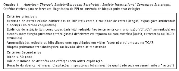 Esses peritos produziram um consenso internacional que discute a FPI de maneira abrangente e inclui critérios que podem ser usados para se fazer o diagnóstico de FPI com e sem a realização de biópsia pulmonar (Quadro 1).
