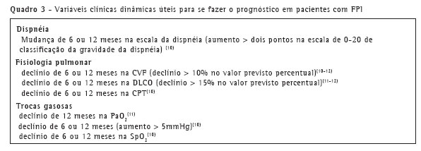 Variáveis clínicas dinâmicas: Mudanças nas variáveis clínicas ao longo do tempo têm se revelado como úteis preditores de desfecho (Quadro 3). Sabe-se há vários anos que a resposta à terapia num período inicial de observação de três a seis meses (medida com base nos sintomas, radiologia e fisiologia) está associada ao prognóstico.(9)Atualmente, investigações mais aprofundadas têm mostrado que mudanças na dispnéia ou fisiologia pulmonar facilmente medida são bons preditores de sobrevida, sendo muito melhores que os valores basais.