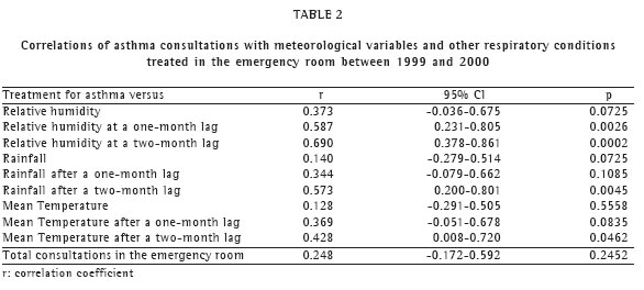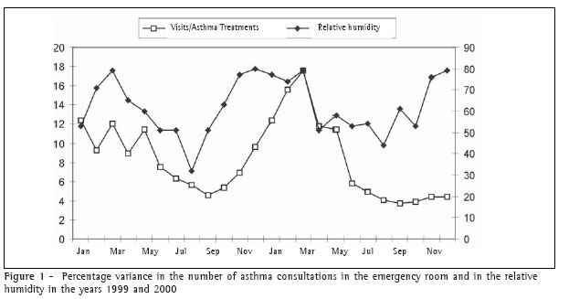 In conclusion, our data show that the number of asthma-related emergency visits varies with the seasons, rising one to two months after an increase in the relative humidity and dropping during the drier seasons. It is an accepted fact that inflammation and bronchial hyperresponsiveness render the airways susceptible to various specific agents (allergens) and nonspecific factors (viral infections, cold air, exercise, passive smoking, and pharmacological agents), both of which can cause airway obstruction and asthma symptoms. Therefore, the hypothesis that the proliferation of mites and fungi during the warmer, humid season triggers asthma attacks in our region is plausible. In this case, the adoption of preventive measures and environmental controls can reduce asthma-related morbidity.