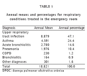 The annual mean and percentage of respiratory conditions treated in the emergency room are both shown in Table 1. Among the diagnoses made, asthma (at 24.4%) was second only to upper respiratory tract infections (at 47.1%).