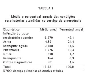 A média e o percentual anuais das condições respiratórias atendidas no serviço de emergência são mostrados na Tabela 1. Asma foi o segundo diagnóstico mais freqüente (24,4%), só ficando atrás das infecções do trato respiratório superior (47,1%).