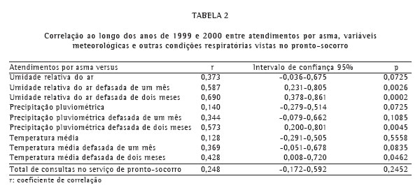 Encontrou-se também uma correlação positiva e significativa entre precipitação de chuva e temperatura média defasadas de dois meses em relação às visitas emergenciais por asma (Tabela 2).