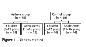 The groups were subdivided by age (children and adolescents). The asthma group comprised 36 children and 39 adolescents, and the control group comprised 46 children and 44 adolescents.