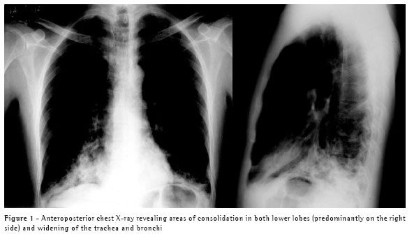 A few days after the treatment with erythromycin, however, the patient again presented productive cough, accompanied by fever, and the X-ray revealed no improvement in the consolidation. The patient was again hospitalized and was submitted to sputum smear microscopy, which revealed innumerable polymorphonuclear cells and abundant gram-positive cocci. Sputum culture was unavailable. The patient started being treated with intravenous oxacillin, and a satisfactory clinical response was obtained in a few days, which was the response that had been expected after the administration of oral cephalexin. After having received oral cephalexin for 48 h, the patient again presented fever, which led us to return to the intravenous treatment and transfer him to a hospital possessing more advanced equipment in order to perform a more elaborate etiological investigation. The new sputum smear microscopy revealed polymicrobial flora, and the patient was started on ceftriaxone combined with amikacin.