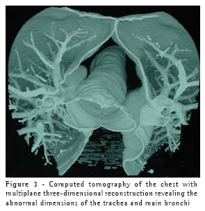 Mounier-Kuhn syndrome is occasionally found in asymptomatic individuals. When symptomatic, it is characterized by recurrent pneumonia, sometimes evolving to chronic productive cough, occasional hemoptysis, and progressive dyspnea as a result of the pulmonary involvement. More rarely, massive hemoptysis,(4) spontaneous pneumothorax, and digital clubbing can be observed. We believe that, in the case in question, the syndrome was responsible for the inappropriate response to the appropriate antibiotic therapy, which led us to suspect of a structural abnormality of the airways.
