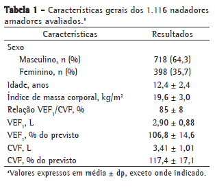 ResultadosEmbora não se tenha podido determinar o número real de participantes, considerando-se que 4.014 nadadores foram inscritos na competição de natação, 1.116 (27,8%) preencheram o questionário e realizaram a espirometria de repouso. Esse tamanho amostral foi o maior que pôde ser obtido por nossa equipe. Nosso objetivo foi avaliar pelo menos 25% dos nadadores que participaram da competição (definido durante o delineamento do estudo), então atingimos o tamanho amostral pretendido. Como pode ser visto na Tabela 1, a maioria dos nadadores era do sexo masculino, tendia a ser magra (índice de massa corporal médio: 19,6 kg/m2) e apresentava função pulmonar normal. A média de idade dos participantes era de 12,4 ± 2,4 anos, e os participantes estavam igualmente distribuídos na faixa etária estudada.