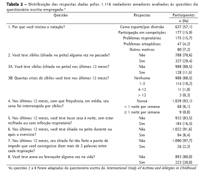 Os questionários foram preenchidos por 383 nadadores (34,6%), 611 pais de nadadores (54,7%), 53 técnicos de natação (4,7%) e 66 parentes não nucleares de nadadores (5,9%). Em geral, os participantes começaram a nadar para praticar um esporte. Porém, 175 participantes (15,7%) consideravam a natação como um possível tratamento para seus problemas respiratórios (Tabela 2). A ocorrência de sintomas de asma foi comum. Dos 1.116 participantes, 327 (29,3%) relataram histórico de sibilos (chiado), 128 (11,5%) relataram sibilos (chiado) nos últimos 12 meses e 223 (20,0%) relataram asma ou bronquite alguma vez na vida. Não houve diferenças entre os gêneros em relação à prevalência de sintomas de asma (p < 0,05; dados não apresentados).