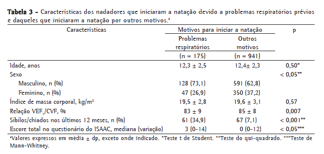 O grupo de nadadores que relatou ter começado a nadar para tratar seus problemas respiratórios (n = 175) mostrou algumas características particulares, tais como maior prevalência do sexo masculino, de obstrução ao fluxo aéreo e de sintomas de asma, quando comparados a outros nadadores da mesma idade (Tabela 3).