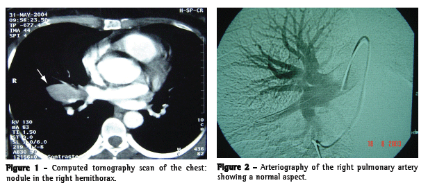 We performed pulmonary arteriography, which did not reveal a relationship between the nodule and the pulmonary artery (Figure 2). The bronchoscopy findings were normal. The thoracotomy was performed, and an extrapulmonary nodule was found between the superior and middle lobes. The nodule was easily resected.
