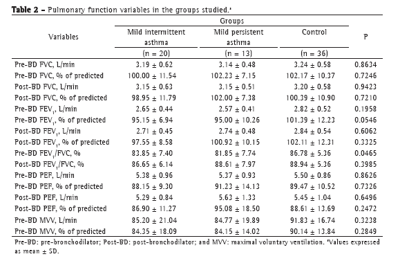 The anthropometric characteristics were similar among the three groups studied (mild intermittent asthma, mild persistent asthma, and control), as were the physical activity characteristics. As shown in Table 1, ANOVA showed no statistically significant differences among the groups regarding age, body mass, height, or percentage of body fat; in addition, the Kruskal-Wallis test showed no statistically significant differences among the groups regarding the level of physical activity, as measured by the IPAQ score.