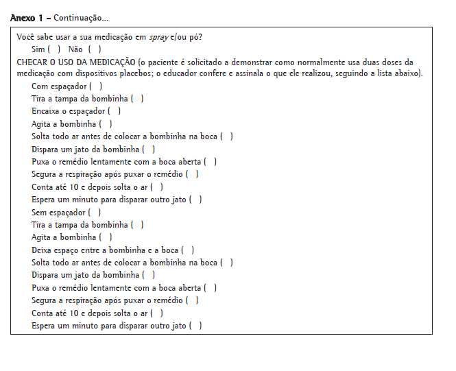 número de visitas à unidade de emergência e número de dias em que não foi possível realizar atividades de vida diária, trabalho e/ou lazer devido à asma. A estrutura do programa de educação, melhora clínica e o questionário de avaliação (Anexo 1) foram elaborados por uma equipe multidisciplinar formada por médicos pneumologistas, médicos alergistas, médicos clínicos gerais e fisioterapeutas respiratórios, sendo estes últimos os responsáveis por sua aplicação.