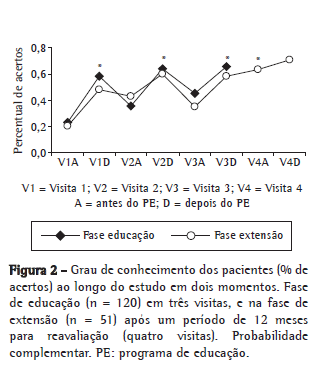A Figura 2 também mostra o resultado do questionário de conhecimento de 51 pacientes que foram reavaliados na fase extensão (V4). Os resultados mostram que a aquisição de conhecimento, em cada visita neste grupo, foi semelhante nos 120 pacientes, confirmando não haver diferença entre os grupos para as variáveis do estudo. Assim, ao analisar a porcentagem de acertos entre V1 e V4, encontrou-se um aumento significante de 0,48 para 0,63 (p < 0,001), indicando que os pacientes mantêm o conhecimento adquirido após um período de 12 meses, e que todo o grupo se comporta da mesma maneira a longo prazo.