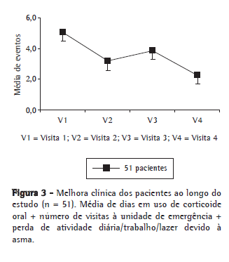 Na Figura 3 são mostrados os resultados referentes à melhora clínica dos 51 pacientes. Analisando o mês anterior a cada visita, observou-se significativa diminuição de procura ao serviço de emergência, de uso de curso de corticoide oral e de faltas no trabalho e/ou escola de V1 para V2 (5,06 ± 0,44 vs. 3,19 ± 0,34; p < 0,05), estabilidade entre V2 e V3, além de nova redução significativa de V3 para V4 (de 3,86 ± 0 ,39 vs. 2,27 ± 0,47; p < 0,05).