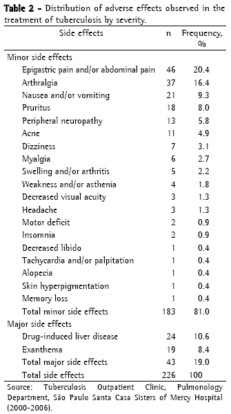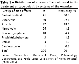 Abstract Objectives: To determine the frequency of adverse effects related to the use of the tuberculosis treatment regimen designated Regimen I and the need for regimen alterations due to these effects. Methods: A retrospective analysis of 329 medical charts of patients who were treated with Regimen I and discharged after cure between March 2000 and April 2006 was carried out at the Tuberculosis Outpatient Clinic, Department of Pulmonology of the Santa Casa de Misericórdia de São Paulo Hospital in the city of São Paulo, Brazil. Adverse effects and the timing of their appearance, as well as subsequent modifications in the treatment regimen, were investigated. Results: We included 297 patients, 146 (49.1%) of whom presented one or more adverse effects related to antituberculosis medications. The frequency of minor side effects was 41.1%, and that of major side effects was 12.8%. The most common reactions were those involving the gastrointestinal tract (40.3%) and the skin (22.1%). Adverse effects were more common in the first and second months of treatment (58.4%). Modification of the treatment regimen was necessary in 11 cases (3.7% of the total sample). Drug-induced hepatitis was the adverse effect that demanded the most regimen changes. Conclusions: In this group of patients, the frequency of adverse effects related to treatment with Regimen I was 49.1%. However, in most of the cases, it was not necessary to modify the treatment regimen due to side effects.
