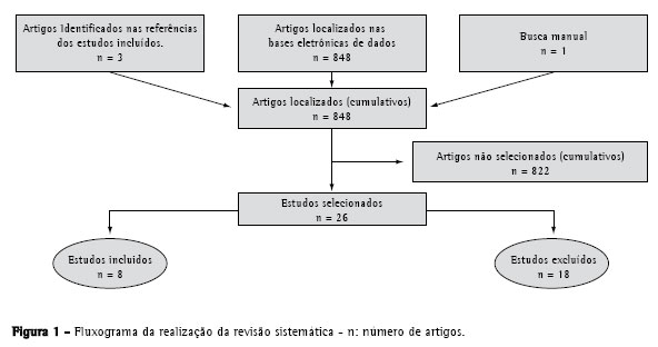 O número dos estudos identificados em cada fonte está descrito na Figura 1, a data da última busca nas bases eletrônicas de dados foi janeiro de 2005, e há um artigo do ano de 2001 encontrado em busca manual.
