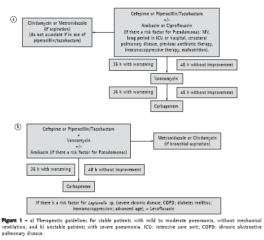 Clindamycin or Metronidazole (if aspiration) (do not associate if in use of piperacillin/tazobactam) Cefepime or Piperacillin/Tazobactam+/-Amikacin or Ciprofloxacin(if there a risk factor for Pseudomonas: MV, long period in ICU or hospital, structural pulmonary disease, previous antibiotic therapy, immunosuppressive therapy, malnutrition).VancomycinCarbapenem36 h with worsening36 h with worsening48 h without improvement48 h without improvementaCefepime or Piperacillin/Tazobactam+Vancomycin+/-Amikacin (if there a risk factor for Pseudomonas)Metronidazole or Clindamycin(if bronchial aspiration)36 h with worsening48 h without improvementCarbapenemIf there is a risk factor for sp. (severe chronic disease; COPD; diabetes mellitus; immunosuppression; advanced age), + LevofloxacinLegionella Figure 1 - a) Therapeutic guidelines for stable patients with mild to moderate pneumonia, without mechanical ventilation; and b) unstable patients with severe pneumonia. ICU: intensive care unit; COPD: chronic obstructive pulmonary disease.