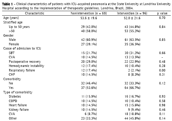 The results of the present study suggest that the implementation of therapeutic guidelines for the treatment of ICU-acquired pneumonia can be effective in lowering the rates of pneumonia-relatedmortality. However, the implementation of the guidelines had no effect on treatment duration, time spent in the ICU, or the length of hospital stays.