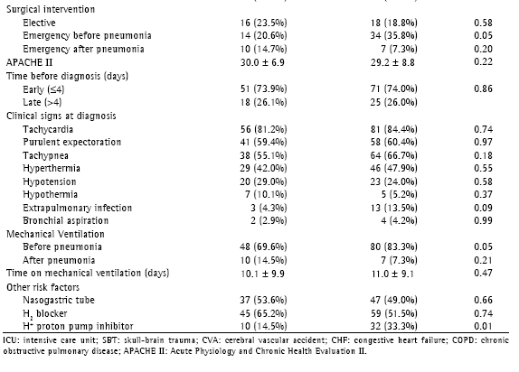 Data collected at inclusion were as follows: identification data - admission dates (hospital and ICU), date of pneumonia diagnosis, reason for admission to hospital, and reason for admission to ICU; presence of comorbidities; previous antibiotic therapy (type and duration of use); clinical data - arterial blood pressure, pulse, temperature, heart rate, and respiratory rate; acute physiology and chronic health evaluation II score (APACHE II); previous MV; nasogastric tube; use of drugs that alter gastric pH; previous surgery; laboratory data - blood workup, arterial blood gas analysis, sodium, potassium, creatinine, blood culture (two samples), bronchoalveolar lavage, quantitative culture for tracheal secretion. The bronchoalveolar lavage fluid was collected using fiberoptic bronchoscopy and was considered positive at = 104 cfu/mL, and quantitative tracheal aspirate was considered positive at = 106 cfu/mL.