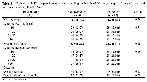 Intervention groupJune of 2002 to June of 2003No. of ICU patients = 854No. of patients included = 1026 patients excluded: 2 using immunosuppressants3 using corticosteroids1 transferred to another hospital96 patients studiedOverall mortality: 49 (51%)Pneumonia-related mortality: 25 (26%)Nonintervention groupJune of 2000 to June of 2001No. of ICU patients = 731No. of patients included = 8112 patients excluded:2 neutropenic 3 non-ICU-acquired pneumonia 3 non-ICU-acquired pneumonia 2 not meeting clinical criteria 4 using corticosteroids69 patients studiedOverall mortality: 40 (57.9%) Pneumonia-related mortality: 37 (53.6%). In the intervention period, 47 patients (49%) were discharged from the hospital (Table 3).