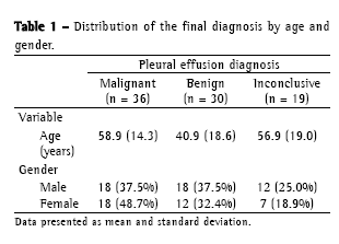 DiscussionRecognizing patients with pleural malignancy if fundamental, since, unlike those with the benign form, for whom the prognosis is favorable, such patients have a mean survival of three to six months.(18) Thoracentesis with cytopathologic study of the pleural fluid, the principal diagnostic method, presents great variation in its sensitivity (40-60%),(1,2,18) which is increased by up to 7% when a pleural biopsy is also performed.(14) Although surgical procedures (thoracoscopy and thoracotomy) present better diagnostic sensitivity for malignant cases (90%), they are expensive and are not available at all medical centers.(20)