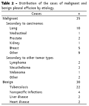 Of the 85 patients evaluated in the present study, 92.9% presented pleural exudate. There was a discrete predominance of malignant pleural effusion (42.4%) over benign pleural effusion (35.3%). These results are similar to those found in the literature, reflecting the frequency of neoplastic pleural effusion, which can account for as much as 50% of the pleural exudates.(21) The distribution found might be related to the fact that this study was carried out at a facility that is a regional referral center for the diagnosis and treatment of thoracic tumors, which might have affected the selection of cases. Twenty-two (76%) of the benign cases were secondary to tuberculosis. This reflects the high prevalence of tuberculosis in Brazil, and the most common presentation of extrapulmonary tuberculosis is the pleural form.(22,23) This high prevalence among the benign pleural exudates was also found in other studies.(20,24,25) In 19 cases (22.3%), it was not possible to differentiate between the benign and malignant cases. Similar results have been described by other authors who reported that, even after cytopathologic study of the pleural fluid and pleural biopsy, approximately 20% of the cases of pleural effusion remain undiagnosed.(26)