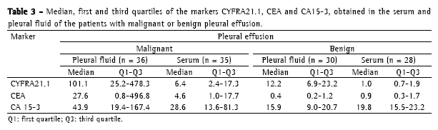 In this study, the concomitant determination of serum and pleural levels of the CEA, CYFRA21-1 and CA 15-3 markers had the objective of determining whether the concentrations of these markers were comparable in the two sample types, since the pleural fluid is a blood filtrate and, as such, should be correlated with the blood. However, some authors have reported that the concentrations of tumor markers are greater in the pleural fluid than in the serum, suggesting the local production of some markers, especially those such as CYFRA21-1 (secreted by mesothelial cells), which might alter the overall sensitivity of the marker.(5,11,21)