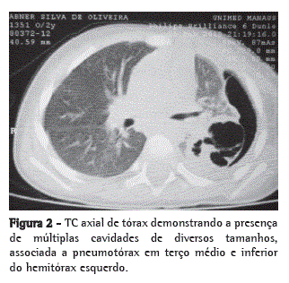 A persistência de febre, dor torácica, sinais de desconforto respiratório, piora do quadro clínico ou surgimento de novas complicações secundárias à pneumonia na vigência de antibioticoterapia otimizada podem sugerir necrose pulmonar.(6,8,9) Nesses pacientes, está indicada a realização da TC axial torácica, mesmo se a radiografia de tórax não demonstre nenhuma anormalidade, pois essa é pouco sensível e raramente apresenta algum achado precoce característico das complicações necróticas.(8-10) Os achados na TC axial de tórax mais característicos na PN são o aparecimento de áreas de menor densidade e cavidades múltiplas, com ou sem níveis hidroaéreos que podem coalescer e formar uma única e extensa cavidade.(10,11) Nesta série, todos os pacientes foram submetidos à TC axial de tórax, e o achado mais comum foi a presença de múltiplas cavidades. Em 75% dos pacientes, a radiografia torácica realizada antes da TC axial já evidenciava a presença dessas cavidades.
