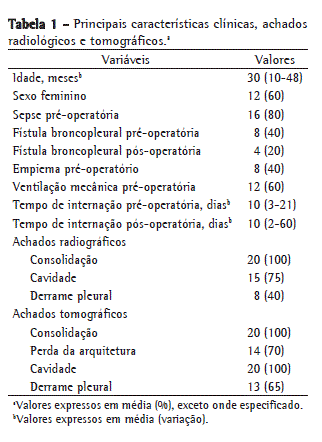 De um total de 103 pacientes portadores de processo infeccioso pleuropulmonar atendidos no serviço de cirurgia torácica, 20 deles foram submetidos à ressecção pulmonar para o tratamento de PN, sendo que 12 (60%) eram do sexo feminino. A média de idade dos pacientes foi de 30 meses (variação: 10-48 meses). Todos os pacientes apresentavam tosse produtiva, febre, sinais de desconforto respiratório e áreas de consolidação pulmonar na radiografia de tórax no momento da internação. Em 15 (75%) desses pacientes, a suspeita de PN foi embasada inicialmente por achados de cavidades na radiografia de tórax. Todos os pacientes foram submetidos à TC axial de tórax, que evidenciava múltiplas cavidades de tamanhos diferentes, indicando necrose do parênquima pulmonar. A média do tempo de internação pré-operatória foi de 10 dias. As principais características clínicas e os principais achados radiográficos e tomográficos estão expostos na Tabela 1.