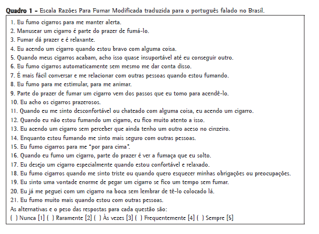 Em 1966, Tomkins descreveu o tabagismo como uma maneira empregada pelos indivíduos para controlarem os sentimentos.(4) Ele propôs a existência de quatro características motivacionais para o comportamento dos tabagistas: (i) a busca de sentimentos positivos; (ii) o alívio de sentimentos negativos; (iii) a presença de dependência; e (iv) o hábito. Baseados nesse modelo teórico, dois autores propuseram uma escala com o propósito de identificar os motivos predominantes que levariam diferentes indivíduos a fumar.(5) Essa escala foi construída com 23 questões e denominada de Escala Razões Para Fumar (ERPF). A ERPF, em sua versão original com 23 questões ou, mais recentemente, em versões abreviadas de 18 itens, tem sido empregada por décadas na América do Norte e trata-se da medida mais comumente usada para avaliar os motivos psicológicos que levam uma pessoa a fumar.(6) Essa escala foi utilizada em um número substancial de estudos relacionados ao ­comportamento tabágico ao longo dos últimos 50 anos e já foi citada em mais de 80 artigos indexados.(6)
