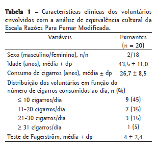 A etapa de avaliação de equivalência semântica e cultural das questões traduzidas foi realizada pela aplicação da versão traduzida em um grupo de 20 funcionários do Hospital das Clínicas de Ribeirão Preto, tabagistas de pelo menos um cigarro em dias alternados, que negavam comorbidades, abordados em momento de lazer, perto do horário de almoço, enquanto fumavam em uma área especialmente designada, externa ao prédio do Hospital. O teste de Fagerström para dependência de nicotina foi igualmente respondido, como medida da gravidade clínica do tabagismo.(14) As características desse grupo de voluntários estão listadas na Tabela 1.