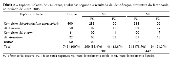 Das 743 cepas estudadas, 608 (81,8%) foram identificadas como pertencentes ao complexo M. tuberculosis pela presença do fator corda; destas, 591 (97,2%) foram confirmadas pelos testes de tipificação convencionais e 17 (2,8%) foram identificadas como micobactérias não tuberculosas (MNT). As espécies identificadas a partir dos métodos convencionais, isoladas em meio líquido e sólido, relacionadas quanto à presença ou ausência do fator corda, podem ser verificadas na Tabela 2.