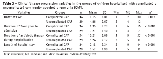 The present study described the characteristics of patients who were diagnosed with complicated or uncomplicated CAP and who were admitted to the pediatric wards of two university hospitals in the metropolitan area of Campinas. We sought to identify variables associated with the development of complications and to determine whether epidemiological or clinical conditions played a role in this unfavorable outcome. The most common complication was pleural effusion, a finding that is consistent with those of other authors.(12,14,17,18)
