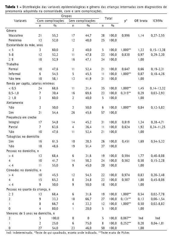 Crianças que apresentavam os diagnósticos de fibrose cística, cardiopatia com repercussão hemodinâmica, malformação pulmonar, neuropatias ou doenças genéticas foram excluídas do estudo. A coleta de dados foi realizada por meio da consulta aos prontuários médicos e da utilização de um questionário semiestruturado, com perguntas fechadas, aplicado aos pais/responsáveis pelas crianças internadas com diagnóstico de PAC no momento da admissão à enfermaria. As principais variáveis estudadas foram idade gestacional ao nascimento, aleitamento materno, idade cronológica na internação, gênero, escolaridade materna, vínculo de trabalho da mãe, renda familiar, frequência a creches, tabagismo, condições de moradia, comorbidades (pneumonia anterior e sibilância recorrente), uso prévio de antibióticos, tipo de complicações e variáveis clínicas e evolutivas. As crianças foram divididas em dois grupos (PAC com e sem complicações).