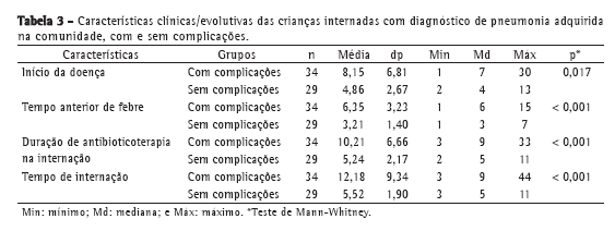 Foram consideradas complicações da PAC derrame pleural, pneumotórax, pneumatocele e abscesso pulmonar. Os pacientes incluídos no grupo com complicações já apresentavam essa condição no momento da internação.